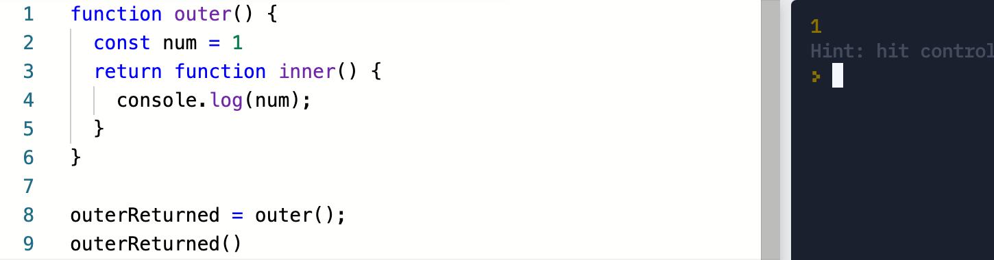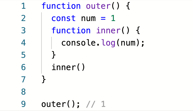 실제로 실행해보면, 1을 정상적으로 뱉는것을 볼 수 있다. 이것이 바로 클로저다. outer 함수는 inner 함수를 반환함으로써 닫혔(Closed) 지만, 그렇다고 해서 자신이 가지고 있던 어휘적 환경(Lexical Scope) 까지는 없애지 않는다.