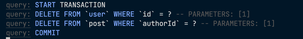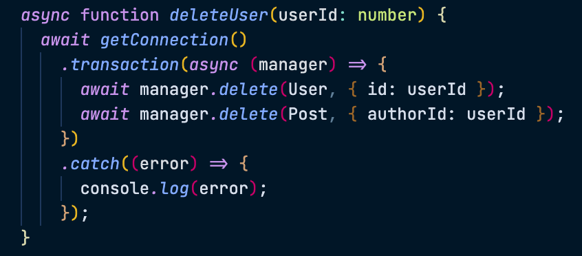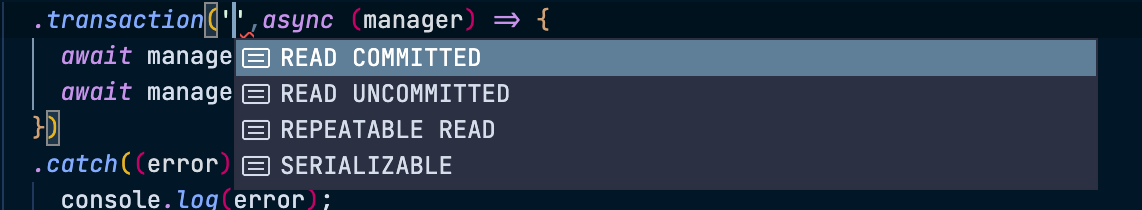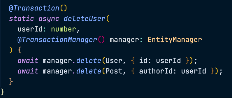 이때도 주의할 점은, TransactionEntityManager 데코레이터를 사용하여 얻은 매니저로만 데이터를 조작해야 한다는 점이다.