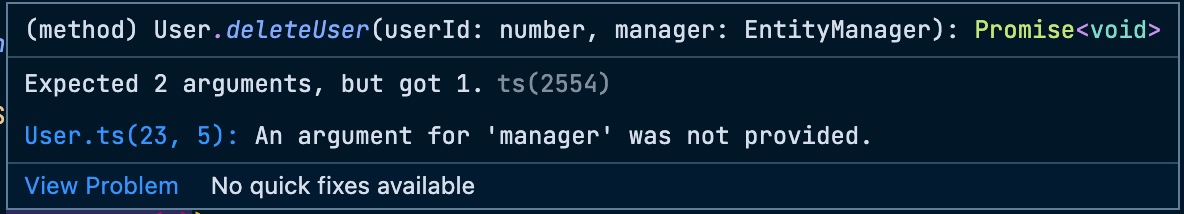 manager 인자는 TypeORM에서 주입하지만 이를 인식하지 못하여 에러가 발생한다. 이를 해결하기 위해 인자의 manager에 Optional Chaining (기호 ?)을 사용하여 인자를 받지 않을 수 있게 하고, 이후에 어떠한 문제가 발생하여 manager가 주입되지 않으면 에러를 던지도록 설정해 둔다.