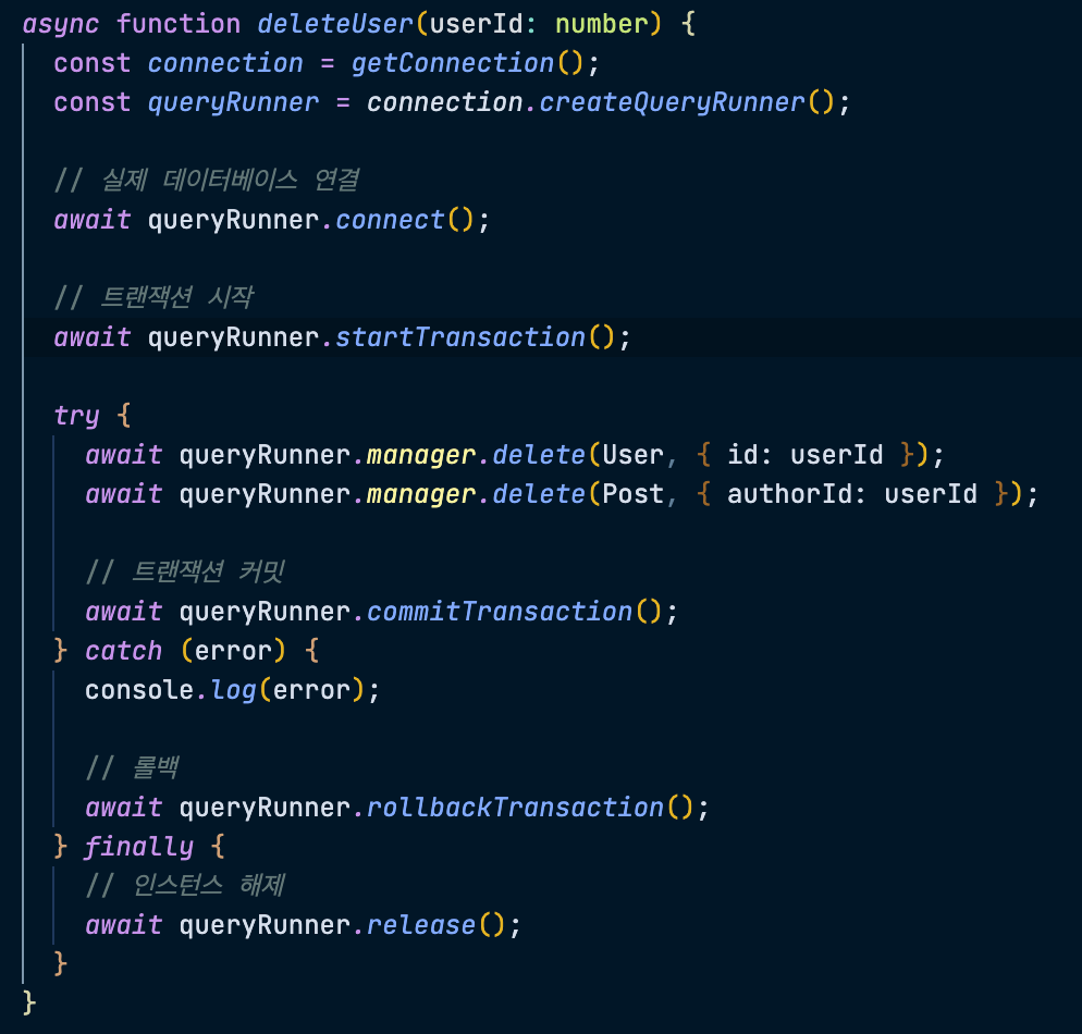 connection으로부터 createQueryRunner 함수를 통해 QueryRunner 인스턴스를 생성할 수 있다. 해당 인스턴스를 connect 함수를 통해 데이터베이스에 연결한 뒤 쿼리를 날리거나 트랜잭션을 수행할 수 있다.
