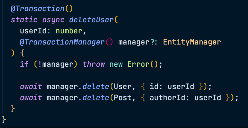 콜백 말고 조금더 JPA스럽게(?) 작성할 수 있는 방법이 있다. 바로 @Transaction() 데코레이터를 이용하는 것이다.