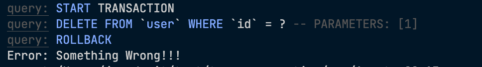 고의로 트랜잭션 중간에 에러를 발생시켜 보면 정상적으로 롤백시키는것도 확인할 수 있다.