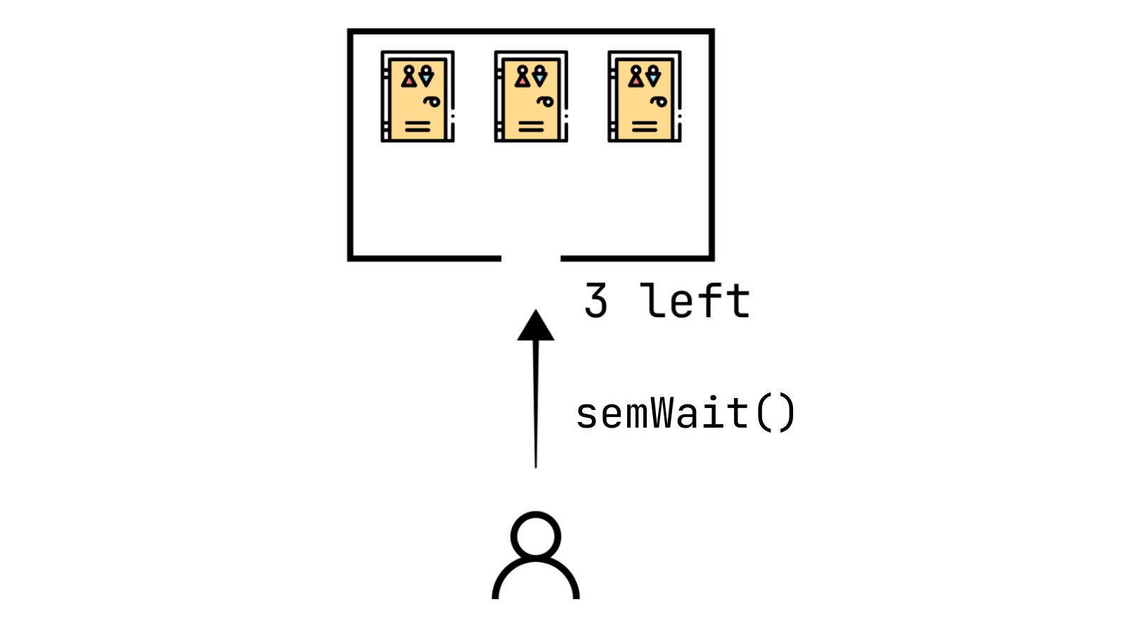 여기서 하나의 스레드가 접근하면, semWait 함수가 호출된다. semWait 함수는 현재 세마포어 변수를 확인하고 0보다 크다면 값을 하나 감소시키고 해당 스레드의 접근을 하용한다. 만약 0 이하라면 값을 하나 감소시키고 해당 스레드의 접근을 막고 대기 큐로 보낸다.