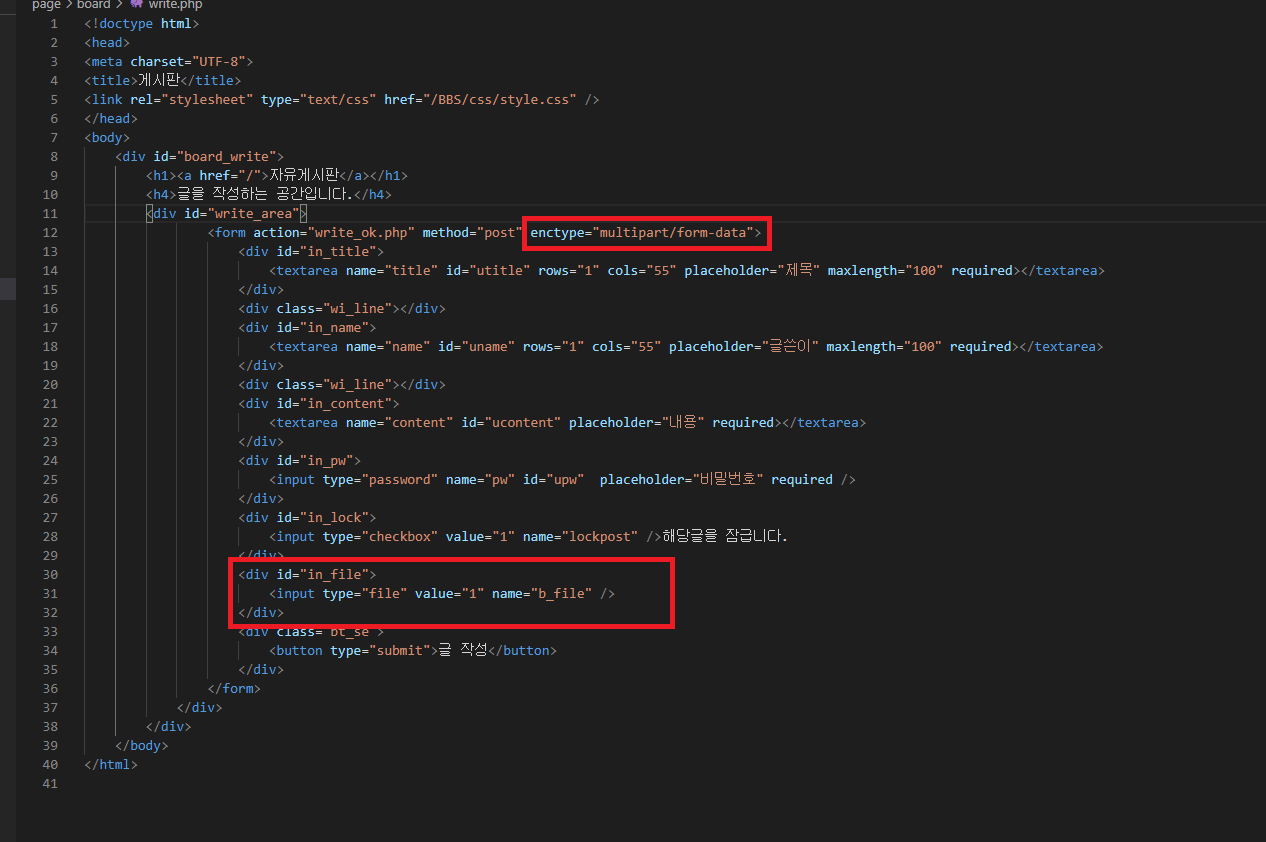 write.php에서 수정해줄 곳은 크게 두 군데이다. 일단 enctype에 multipart/form-data를 줌으로써 기존 post방식보다 더 큰 용량을 전송할 수 있다고 한다. 그리고 in_file div를 새로 추가해 준다.