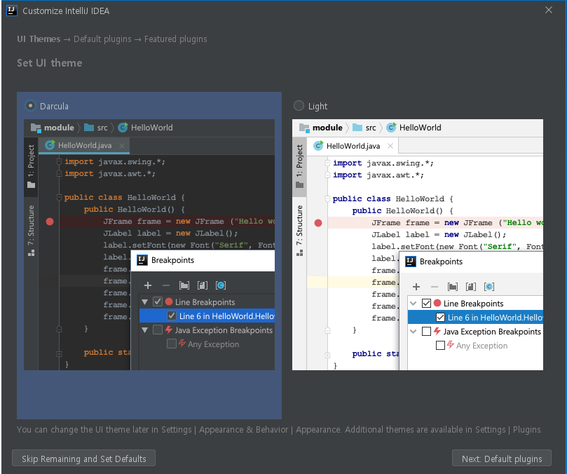 그리고 테마를 설정해 준다. 비주얼 스튜디오를 사용할 때에도 Dark 한 테마를 사용했으니 여기서도 Darcula를 사용했다.