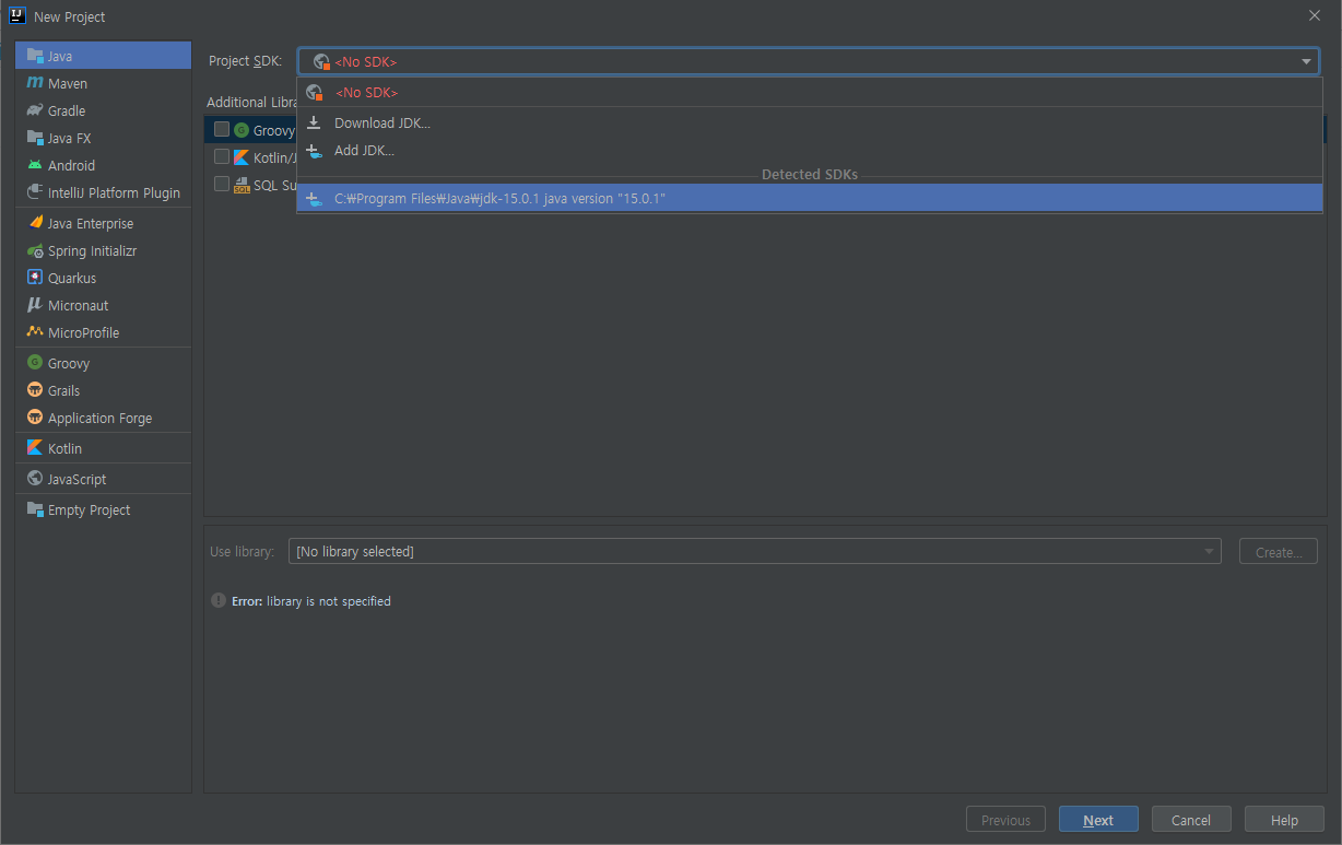 상단에 Project SDK 를 눌러 보면 자동으로 JDK 를 감지하는 것을 볼 수 있다. 만약에 감지되지 않는다면, Add JDK.. 을 통해 직접 경로를 설정해 주면 될 것이다.