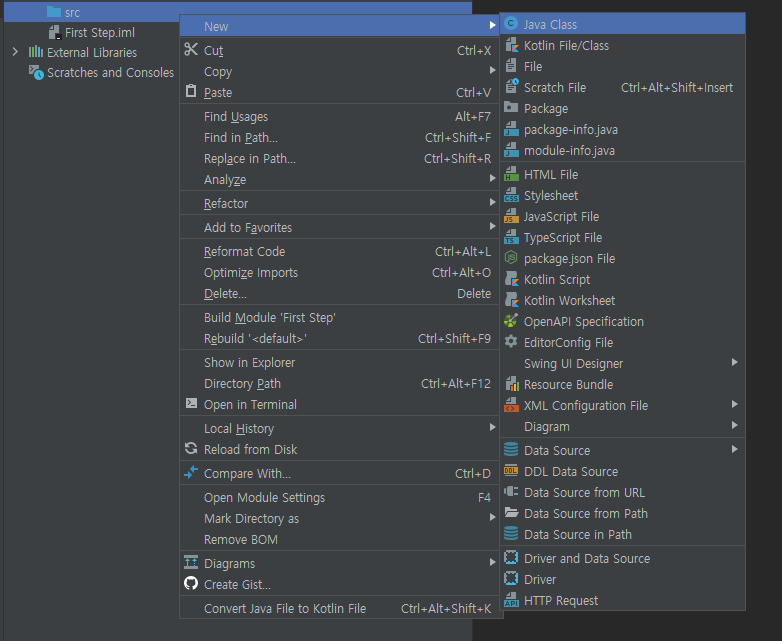 Hello World 를 만들기 위해 Java Class 를 만들어 준다.