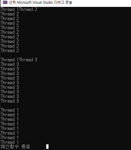 실행해보면, 메인함수 종료만 출력되거나, Thread 1 등등이 조금씩 섞여서 출력될 때도 있다. 이는 detach가 바로바로 스레드를 실행시키고 넘어가기 때문에, 채 10번의 Thread 1 을 출력하기도 전에 메인함수가 종료되어 다른 스레드들도 같이 종료된 것이다.