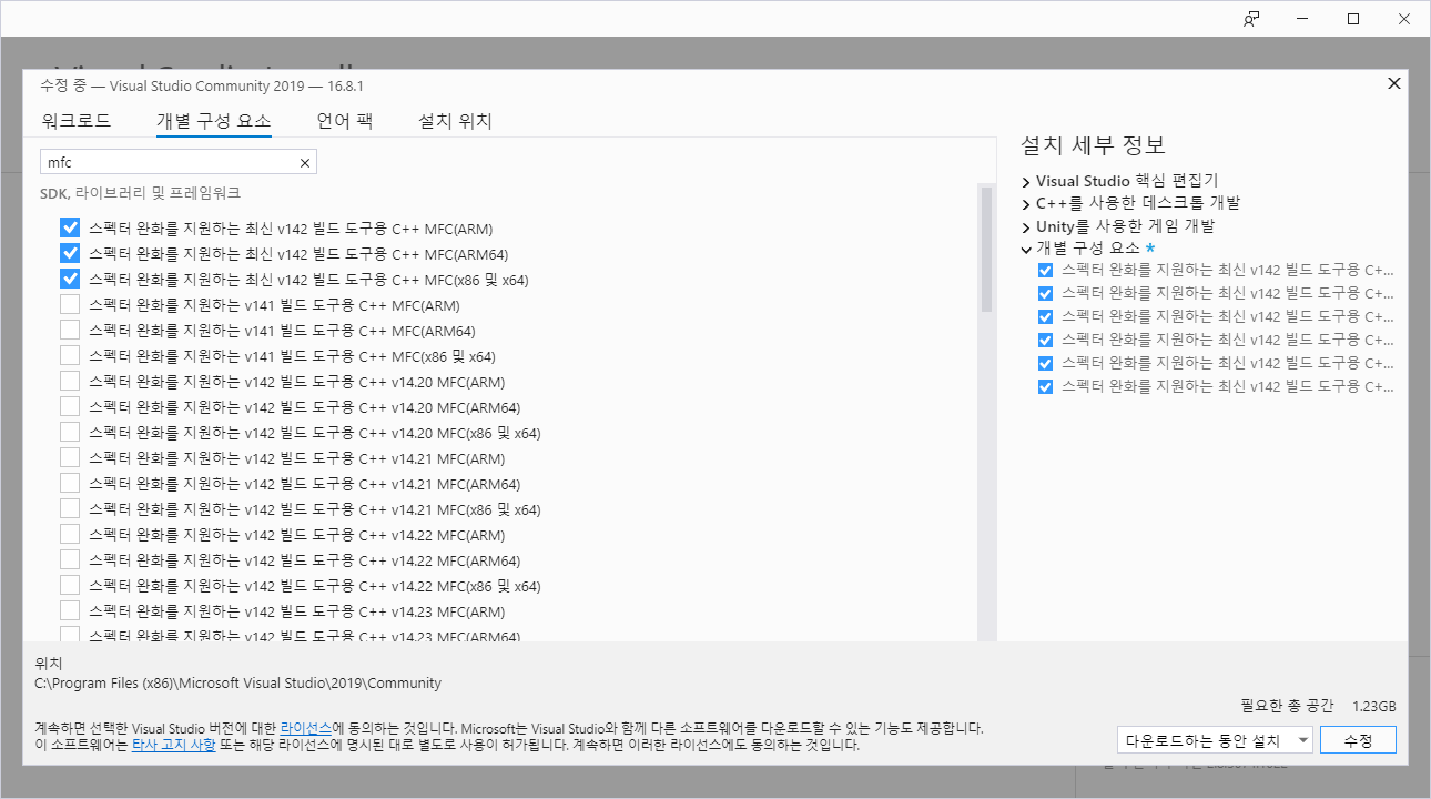 상단의 '개별 구성 요소' 클릭 후 3개 항목을 설치했다.
