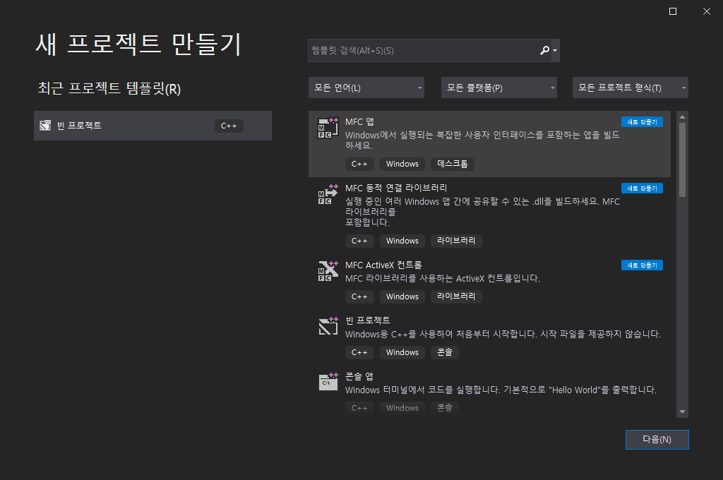 설치가 완료되니 이렇게 MFC 앱 항목이 생겼다. 이걸로 선택하고 프로젝트를 만들었다.