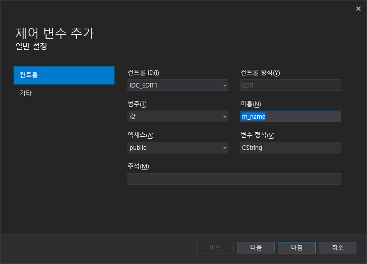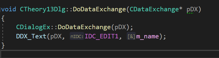 이러한 코드가 추가되었을 것이다. 이는 IDC_EDIT1(입력 상자1) 과 m_name 변수가 연결되었다고 생각하면 된다.