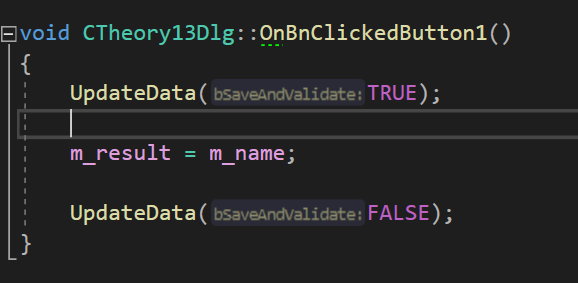 UpdateData() 함수는, 컨트롤러에 어떠한 값이 변경되었을 때, 이를 갱신하고 변수에 저장하기 위한 함수라고 한다.