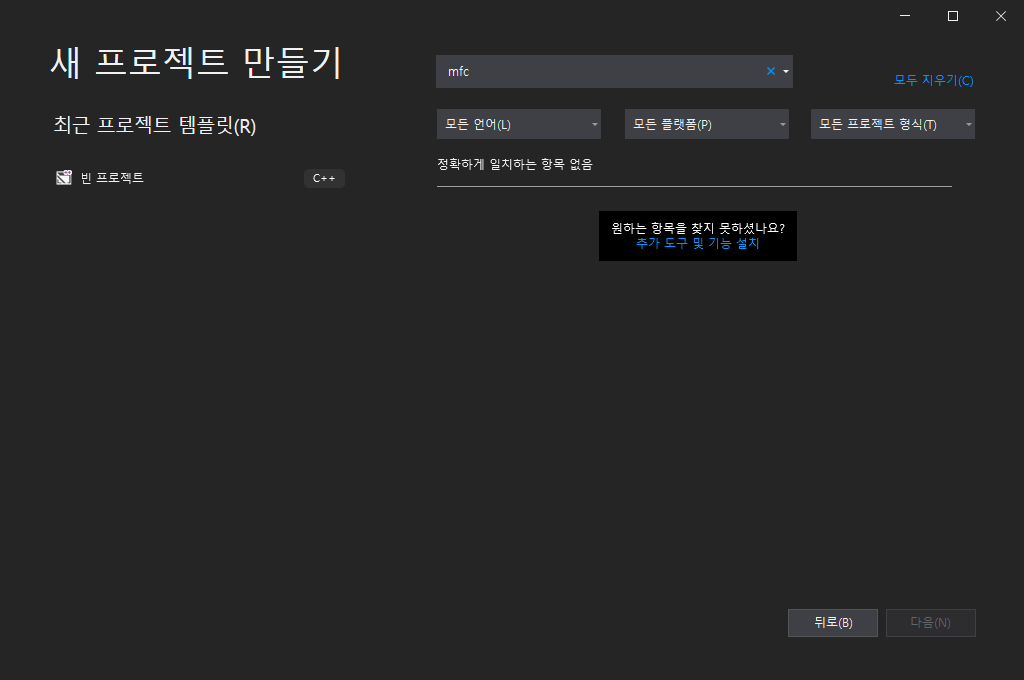 MFC 프로젝트를 생성하려 했는데, 설치되어 있지 않은듯 했다. 그래서 하단에 있는 '추가 도구 및 기능 설치'를 클릭하였다.