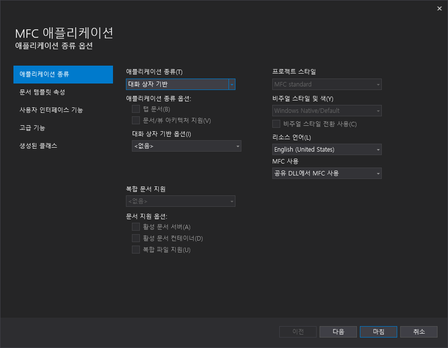 이렇게 어플리케이션 옵션을 선택하는 창이 나오는데, 이번에는 맛만 볼 것이므로 '대화상자 기반'으로 생성하였다.