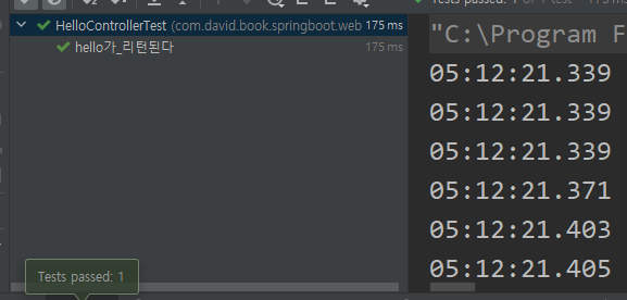 우여곡절 끝에 이제 hello가_리턴된다() 함수를 실행시켜 테스트해본다. Tests passed: 1이 출력되면 테스트 결과는 성공