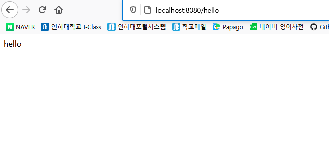 이제 http://localhost:8080/hello 에 접속해보면 hello가 정상적으로 출력된 것도 확인할 수 있다.