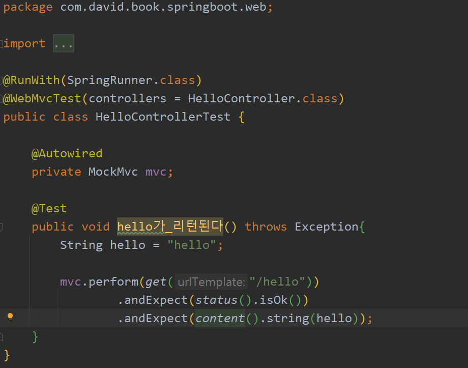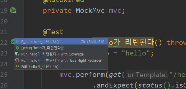 - .andExpect(content().string(hello)) : perform()의 결과를 검증. 즉 여기서는 "hello"가 잘 리턴되었는지 검사