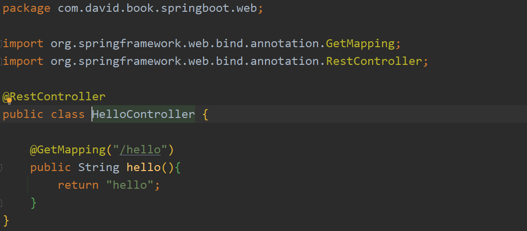 hello() 함수와 이 어노테이션을 통해 이 프로젝트는 /hello의 요청을 받으면 "hello"라는 문자열을 반환하는 기능을 가지게 된다.