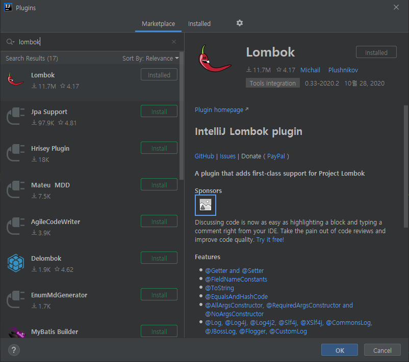 롬복(lombok)을 찾아서 설치해준다. 따로 인텔리제이를 재시작 할 필요는 없었다.