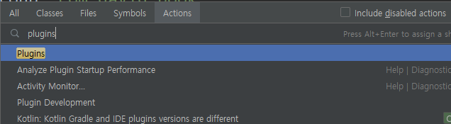 그리고 Ctrl + Shift + A를 눌러 Actions 검색 창을 띄운 뒤, plugins를 검색한다.