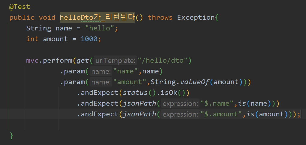 정상작동하는지 테스트를 위해 hello가_리턴된다() 메소드를 작성한다.