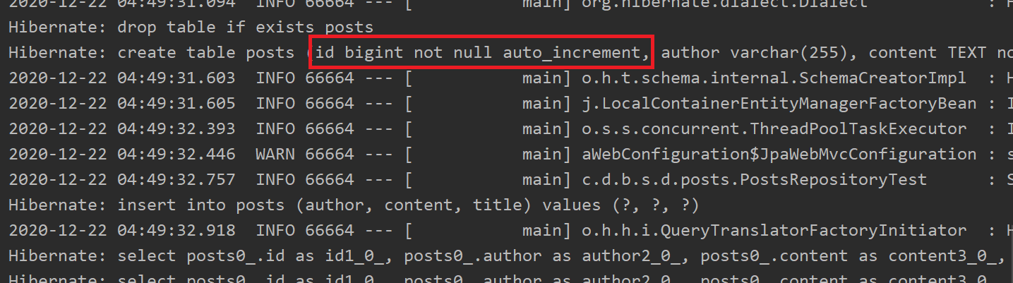 이렇게 실제로 실행된 쿼리를 확인할 수 있다. 그런데 id 를 생성하는 문법이 좀 다른데 이것은 H2의 문법이 적용되어서 그렇다고 한다.