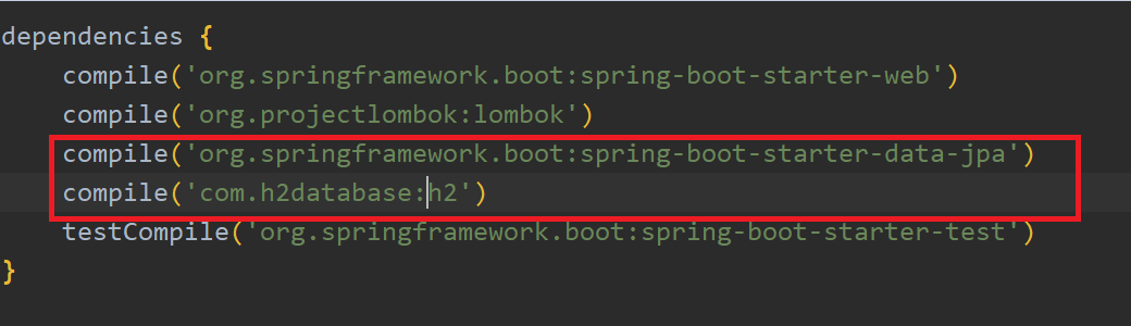 먼저 jpa와 h2 의존성을 추가해 준다. h2는 인메모리 관계형 데이터베이스로, 따로 설치가 필요 없을뿐더러 메모리 상에서 실행되기 때문에 테스트 용도로 많이 사용되는 데이터베이스라고 한다.