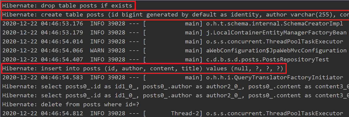 이렇게 진행하고 테스트도 통과하였다. 그리고 테스트 시 log에서 실제로 실행된 쿼리를 확인하고 싶다면,