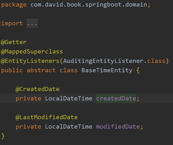 - @MappedSuperclass : JPA Entitiy 클래스들이 BaseTimeEntity를 상속할 경우 필드들도 칼럼으로 자동 인식되도록 함