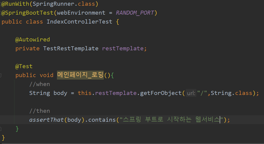 URL 매핑을 담당할 IndexController.java 이다. Mustache 덕분에 "index"로 반환된 문자열은 경로와 확장자를 포함하여 자동으로 지정된다고 한다.