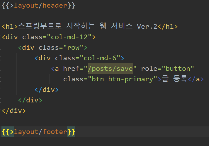 IndexController에도 postsSave() 함수를 추가하여 /posts/save/를 호출 시 posts-save.mustache를 호출하는 메소드를 만들었다. 머스테치가 적용되었기때문에 경로와 확장자는 자동으로 지정된다.