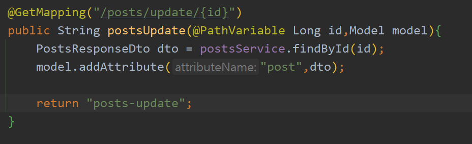 마지막으로 indexController의 글 조회를 위한 index() 함수를 정의한다. Model 객체는 서버 템플릿 엔진에서 넘어온 객체를 저장한다. 여기서는 postsService.findAllDesc()로 가져온 결과를 posts로 index.mustache 에 전달한다.