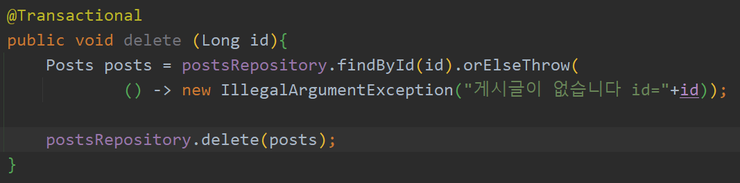 컨트롤러에도 서비스에서 만든 delete 메소드를 호출하기 위한 코드를 작성해주면 끝난다.