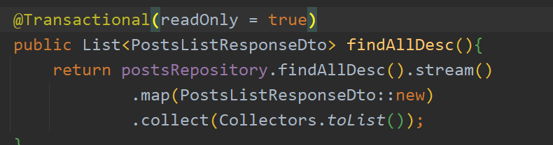 PostsService에도 해당 코드를 추가한다. 테이블들을 가져와서 toList() 를 통해 Dto로 바뀌어 List에 저장되고 반환한다.