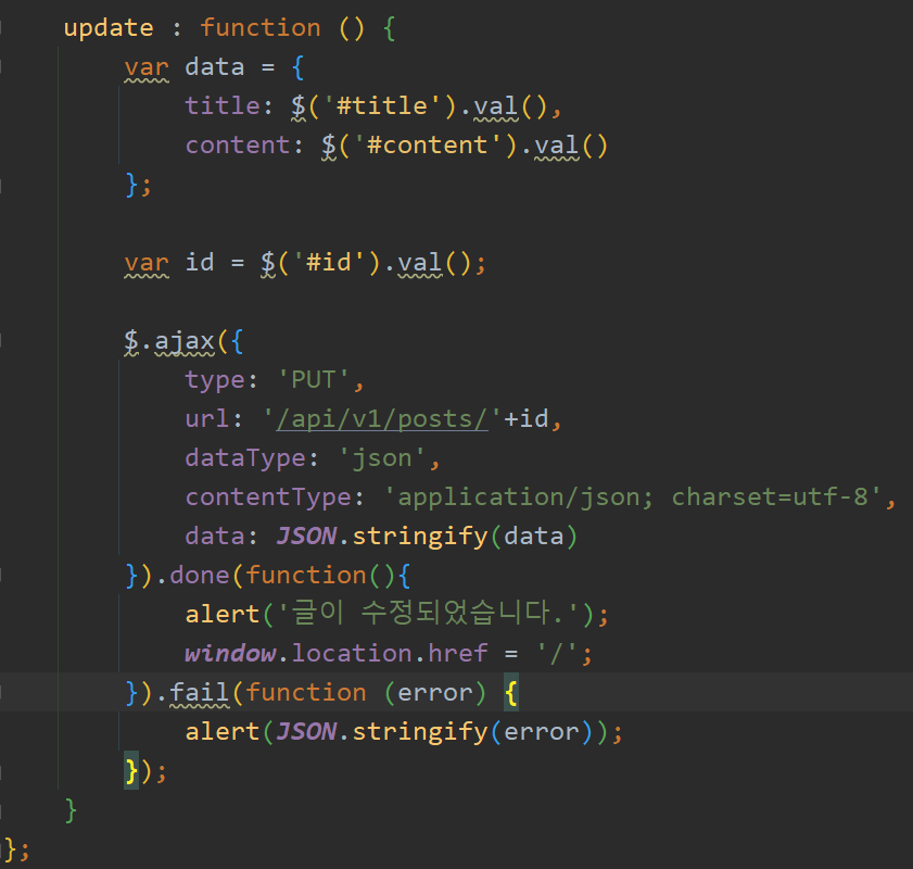 index.js 에도 update 함수의 기능을 작성해 준다. HTTP Method 중 수정에는 PUT 방식을 사용한다.