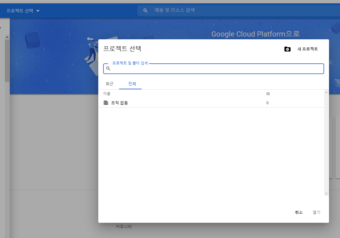 먼저 console.cloud.google.com 으로 이동한 뒤 프로젝트 선택을 눌러 새 프로젝트를 생성한다.