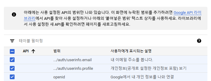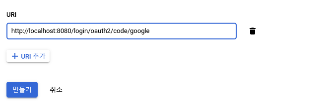 URL에 http://localhost:8080/login/oauth2/code/google 이라고 입력하고 사용자 인증 정보를 만들어 주면 id와 secret code 를 받을 수 있다.