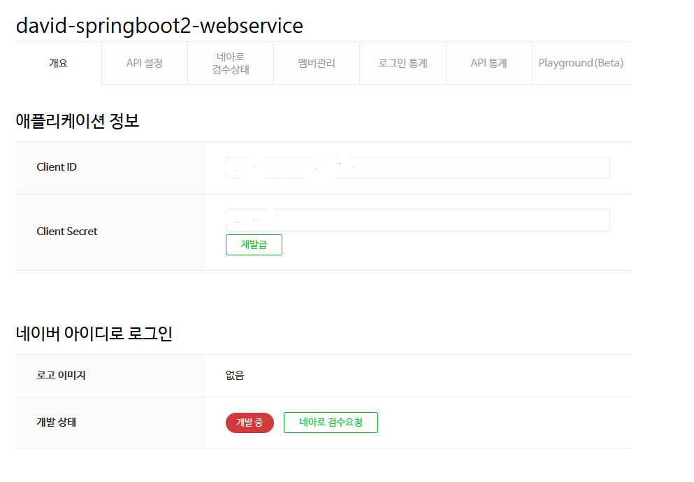 등록하면 이런 화면을 볼 수 있다. 여기서 ClientId와 Client Secret을 복사해서