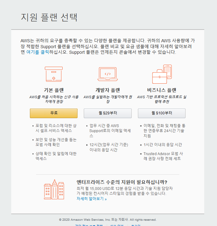 지원 플랜은 일단 기본 플랜 선택