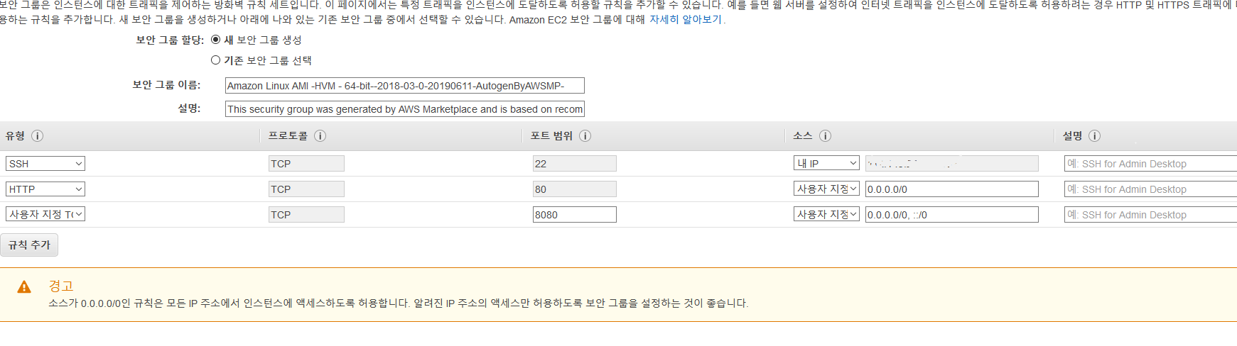 보안 그룹은 SSH를 내 IP로 열어두고, 포트 8080은 전체로 열어둔다.