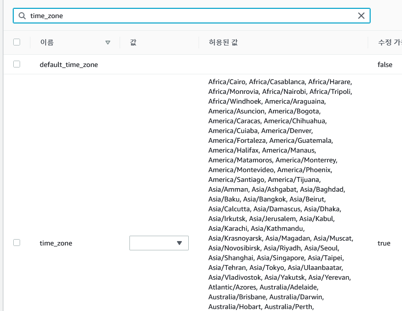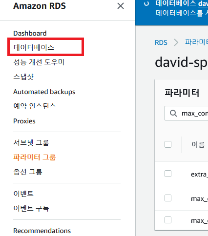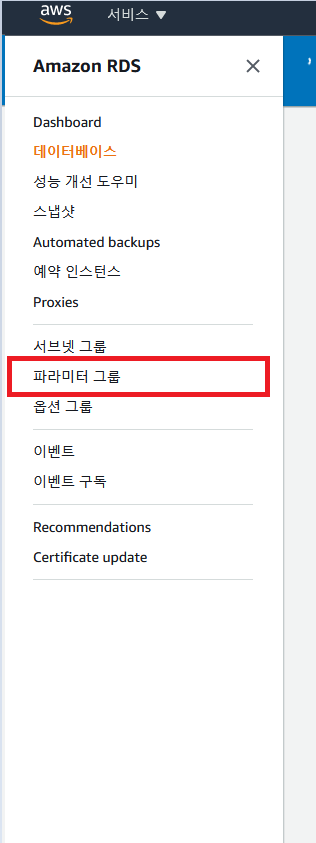 이후 메뉴에서 데이터베이스 -> 해당 DB 선택 -> DB파라미터 그룹을 생성한 그룹으로 만들고 저장한다.