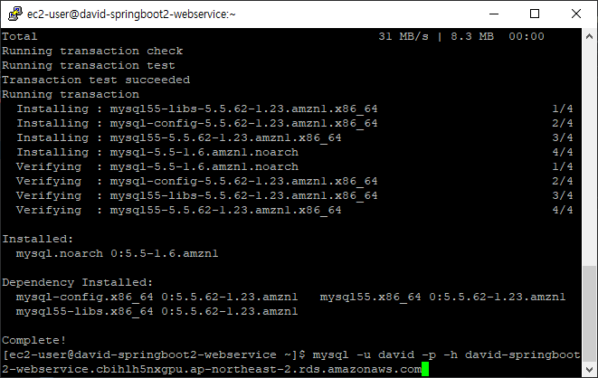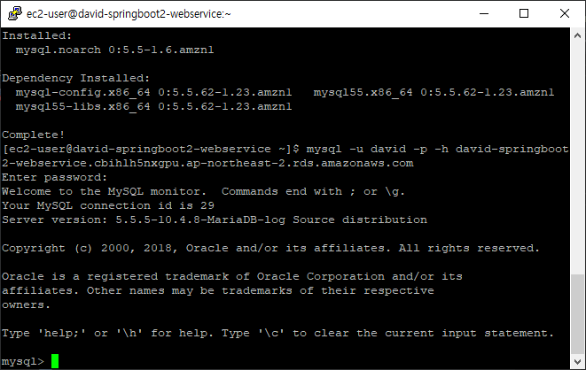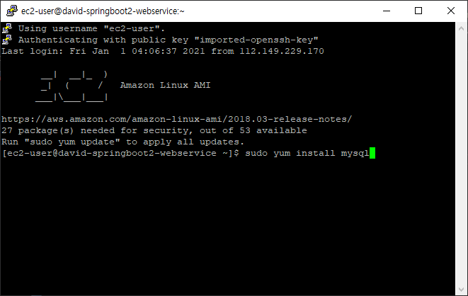 EC2 에서도 RDS에 접속할 수 있는지 확인하기 위해 Putty를 실행하고 먼저 mysql을 설치한다.