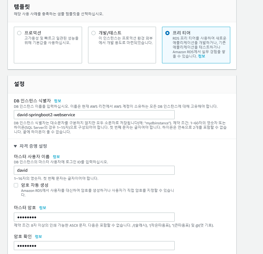 프리티어로 생성, 이름과 마스터사용자 이름, 비밀번호를 지정한다.