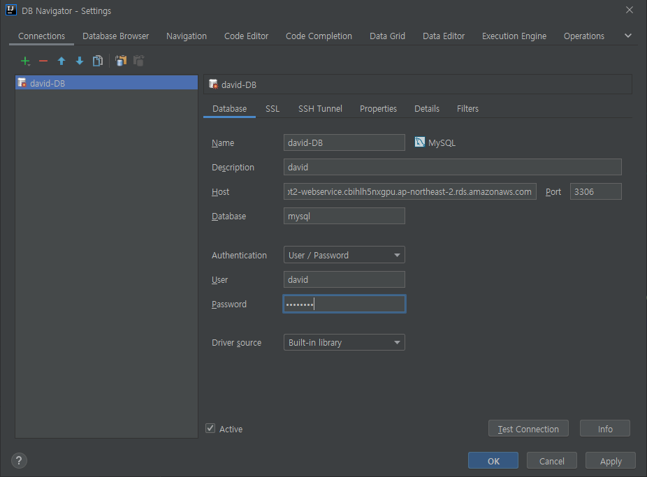 이 창에서 이름을 적당히 지어주고 Host에 엔드포인트를 붙여넣으면 된다. User 와 Password는 이전에 DB를 생성할때 지정했던 그것이다.