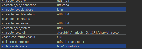 보면 다른것은 다 잘 바뀌어 있는데 character_set_database와 collation_database만 latin 으로 지정되있다.