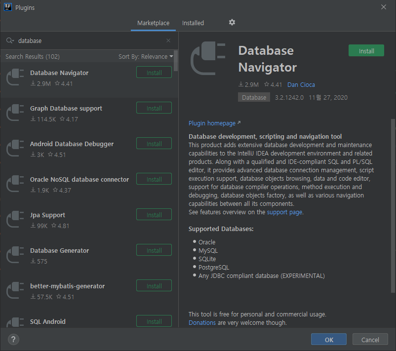 먼저 플러그인 검색을 통해 Database Navigator 를 설치