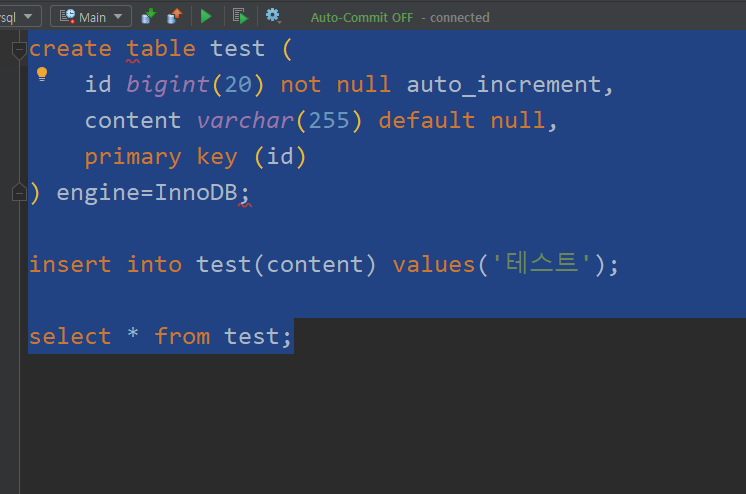 이제 한글 내용을 작성할 수 있는지 확인하기 위해 간단한 test table을 만들어 한글을 넣어본다.