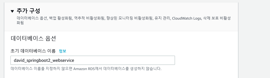 추가 구성에서 데이터베이스 옵션에서 초기 데이터베이스 이름만 적당히 정해주고 저장한다.