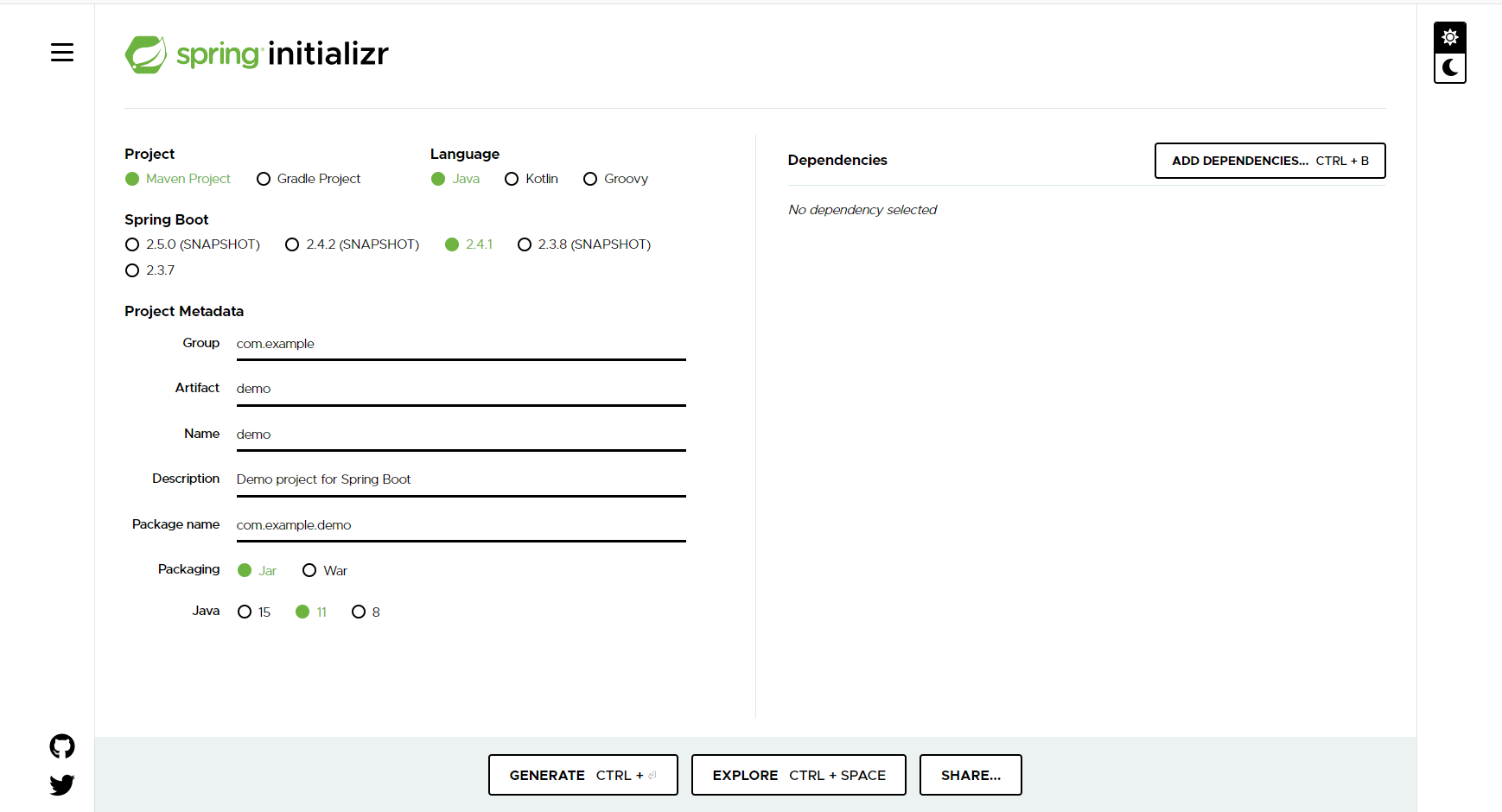 이렇게 스프링 부트 프로젝트를 간편하게 시작할 수 있는 페이지가 나온다. 여기서 여러가지 기본 설정들을 할 수 있다.