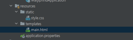 이제 리소스 폴더 내의 static에 style.css 를 위치해주고, templates 안에 main.html을 위치해주면 된다.